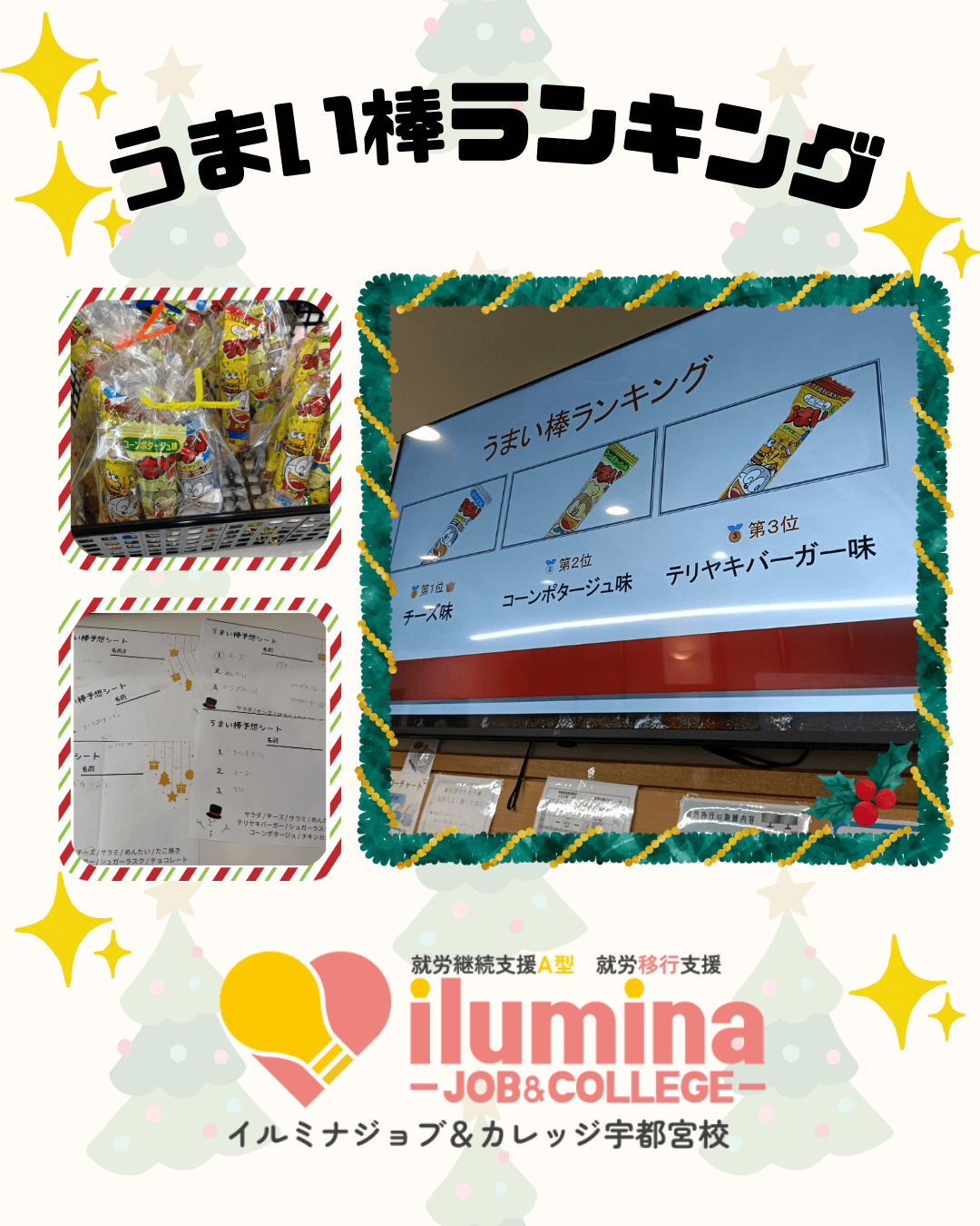 12月25日にはクリスマスのレクリエーションでうまい棒のランキング予想大会を行いました✨