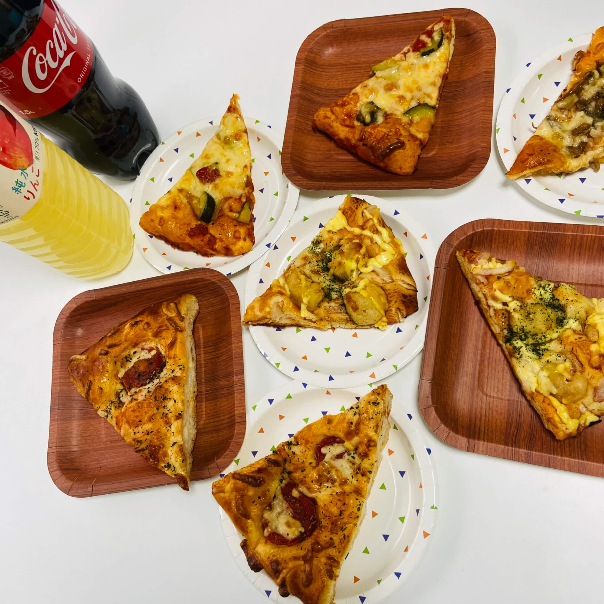 ピザとコーラ、りんごジュースで乾杯しました。